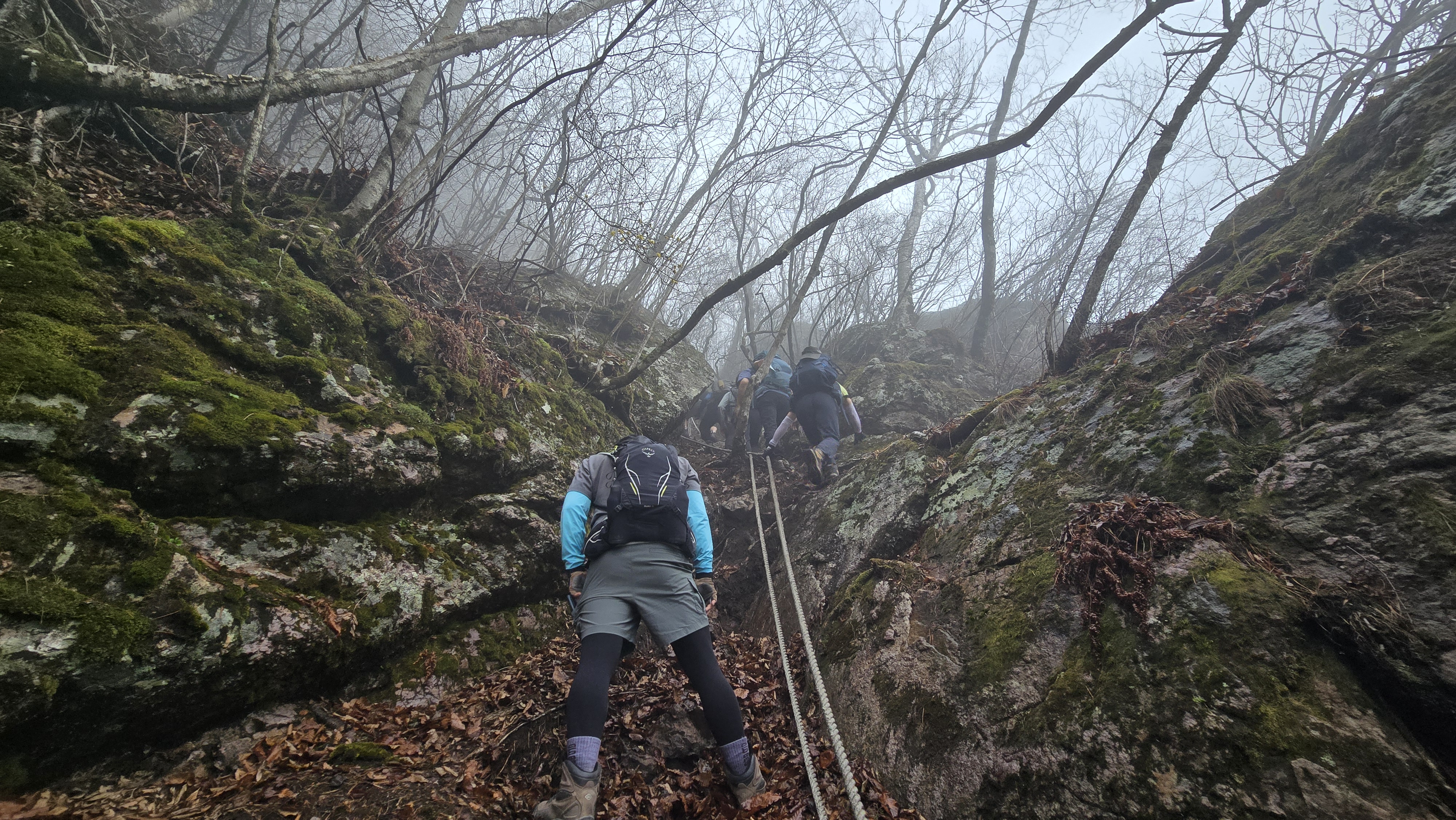 ▲ 작은 달바위봉에서 내려와 달바위봉에서 마지막 로프구간 내려서는 곳을 올려다 본 모습으로, 다른 팀들이 순서대로 내려오면서 조심하라며 큰 소리로 일러주고 있었다