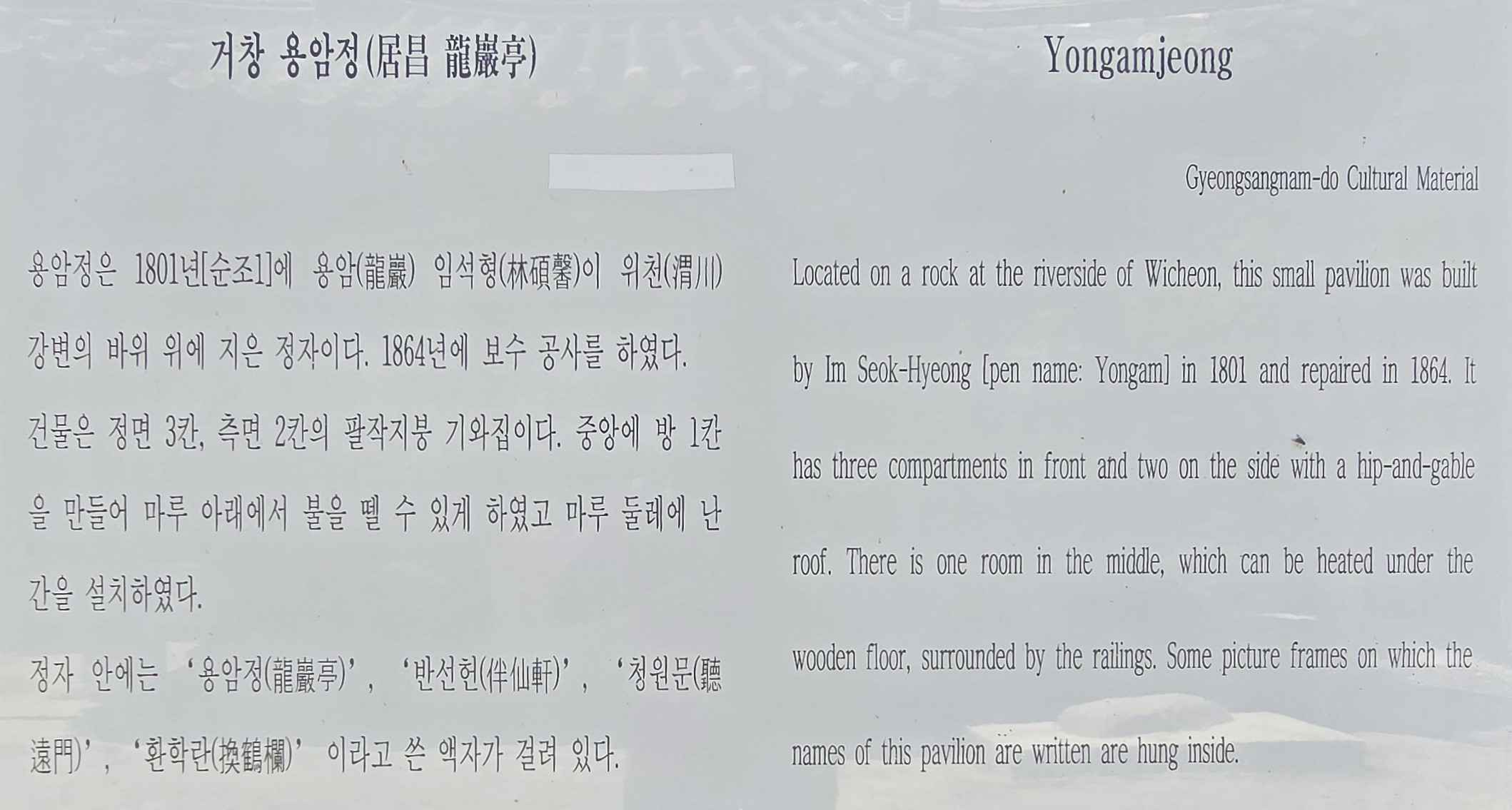 거북바위 암벽 둘레에는 수승대(搜勝臺)라는 한문 글귀와 많은 사람의 이름이 음각되어 있고, 퇴계 선생의 4율시조 및 거창 출신 갈천 임훈(1,500~1,584)의 화답시 등 많은 풍류가들의 시가 새겨져 있다.